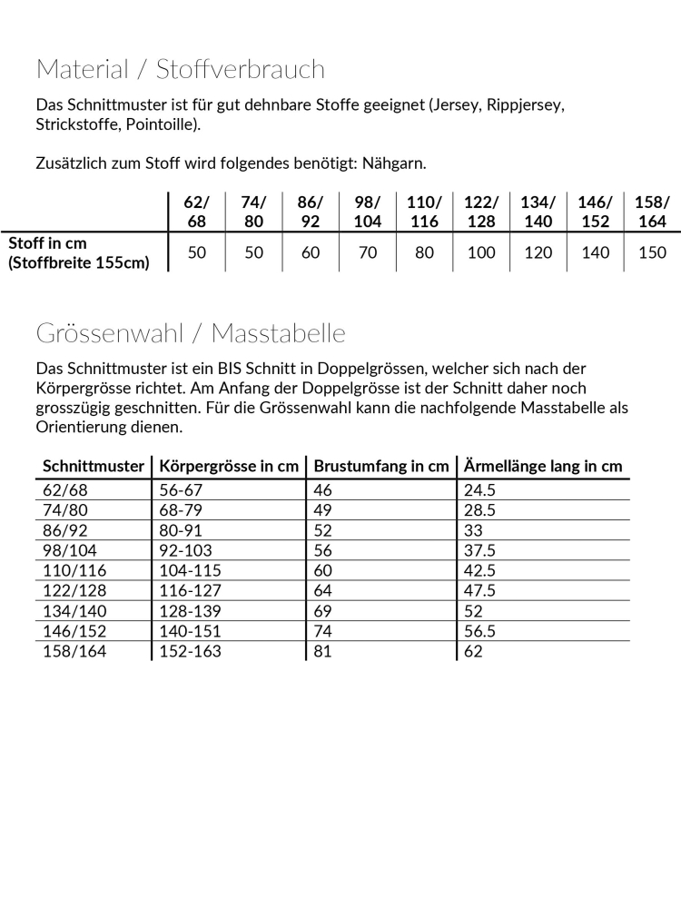 - Nähgrösse 62-164 in Doppelgrössen