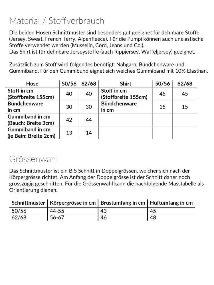 - Stoffempfehlung Hosen: French Terry, Sweat, Jeans-Jersey, Stretch-Jeans. Für die Pumpi auch unelastische Stoffe wie Musselin, Cord, Jeans etc.