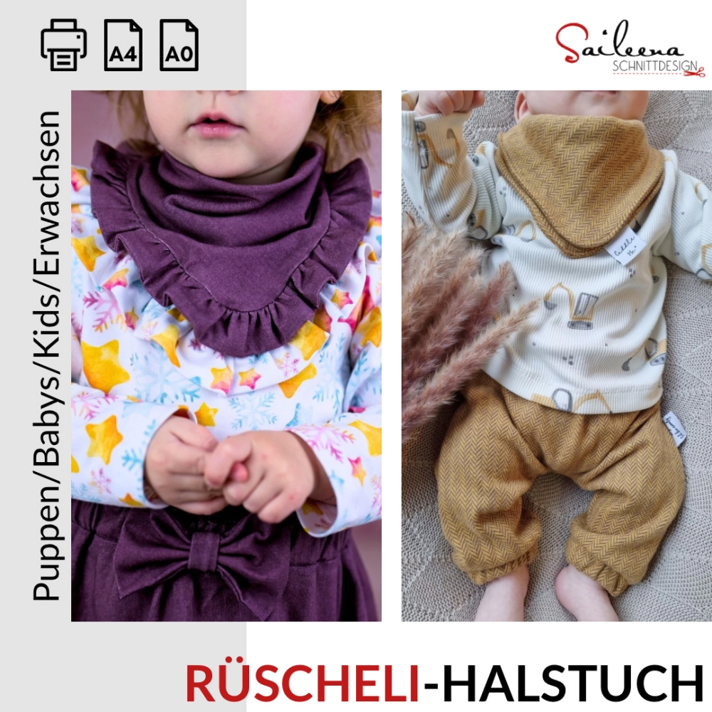 Das Halstuch ist ein hübsches Accessoire für Kinder und Erwachsene. Es ist ein doppellagiges Halstuch mit Rüschen und wird mit Druckknöpfen geschlossen. Durch den Zwei-Lagen-Look wärmt es schön den Hals. Das Halstuch kann auch ohne Rüschen genäht werden und ist dann auch super für Jungs geeignet.